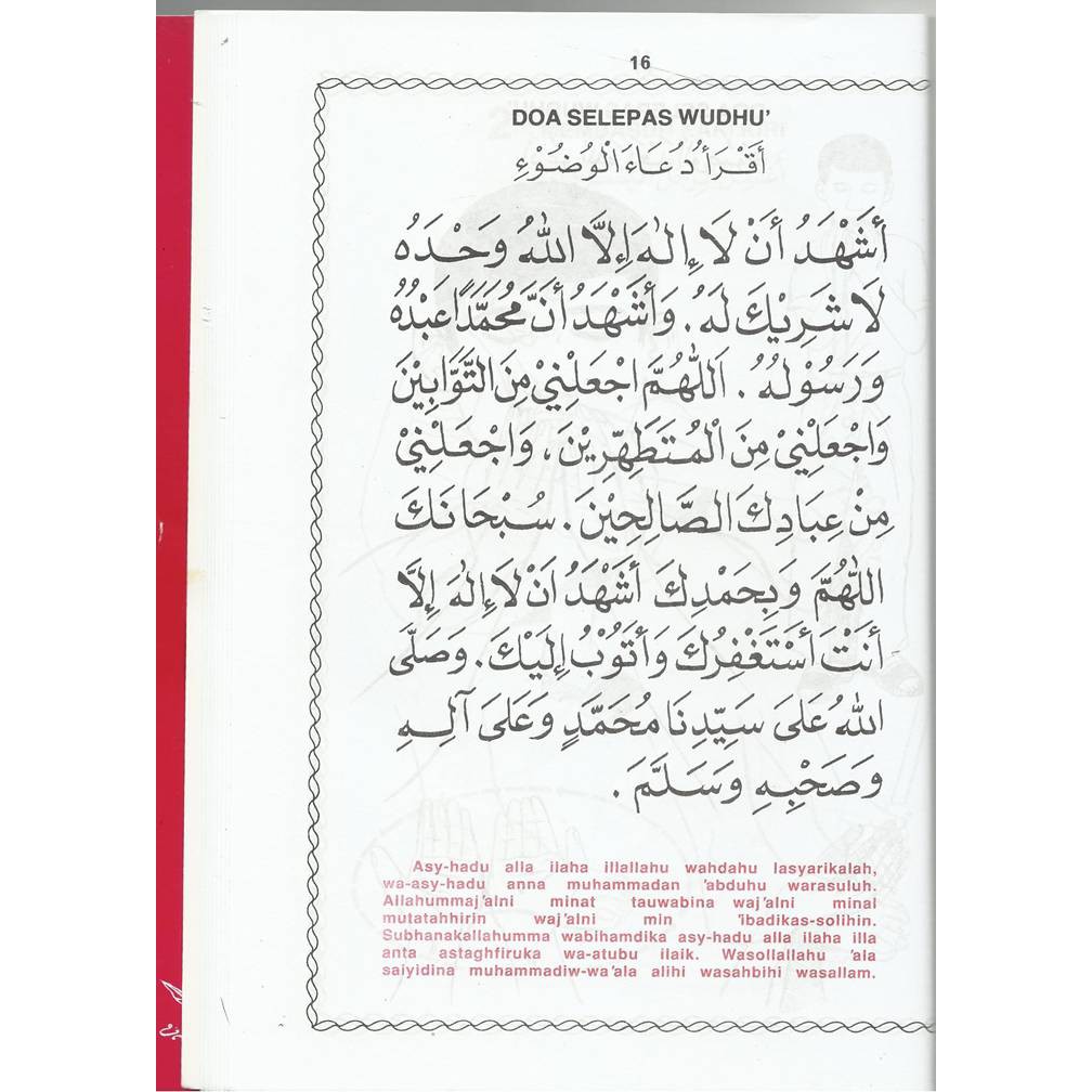 Doa dapat dilakukan di setiap kesempatan, termasuk ketika kita sedang menyucikan diri dari hadast kecil. Panduan ini akan menerangkan secara ringkas niat berwuduk dan doa selepas wuduk dalam ejaan rumi agar mudah dipelajari. Bacaan doa selepas solat beserta maksud. Bacaan doa selepas solat dalam rumi versi 1 Dan doa selepas solat fardhu adalah antara salah satu waktu berdoa yang sangat mustajab. Selain itu admin akan membagikan doa sesudah wudlu. Allahumma rabba hazihid da' watittamah. Ati saiyidana muhammadanil wasilata wal fadhilah. Doa ini diriwayatkan oleh imam tirmidzi dengan sanad yang shahih pula. Alhamdulillahi rabbil 'alamin, wassalatu wassalamu 'ala saidina muhammadin asrafi mursalin, wa 'ala. Seorang mukmin, membaca doa sebelum wudhu dan doa sesudah wudhu adalah ibadah yang sering dilakukan saat berwudhu. Bacaan doa selepas ambil wuduk rumi dan jawi doa harian. Menggunakan air mutlak iaitu air yang suci lagi menyucikan.