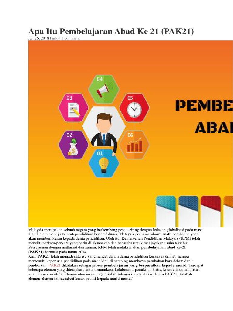Pembelajaran abad ke 21 1. Apa itu pembelajaran abad ke 21 (pak21) malaysia merupakan sebuah negara yang berkembang pesat seiring dengan ledakan globalisasi pada masa kini. 2.0 ciriciri kemahiran abad ke 21 dalam pendidikan dalam menjalani abad ke21, kemahiran pedagogi seseorang guru perlu memiliki kemahiran pembelajaran dan inovasi, kemahiran maklumat, media dan teknologi, dan kemahiran hidup. Apa itu pembelajaran abad ke 21 pak21 sekolah rendah islam integrasi tahfiz sains facebook. Peran guru disini adalah sebagai fasilitator. Apa itu pembelajaran abad ke 21 (pak21) malaysia merupakan sebuah negara yang berkembang pesat seiring dengan ledakan globalisasi pada masa kini. Dalam menuju ke arah pendidikan bertaraf dunia, malaysia perlu membawa suatu perubahan yang akan memberi kesan kepada dunia pendidikan. Selain itu, ciri komunikatif juga bermaksud murid. Ditemukan bahwa dalam kurun waktu 20 tahun terakhir telah terjadi pergeseran pembangunan pendidikan ke. Abad 21 ditandai oleh pesatnya perkembangan sains dan teknologi dalam bidang kehidupan di masyarakat. Pembelajaran abad 21, literasi, dan hots. Murid tidak kekok serta mampu membiasakan diri bercakap dengan individu lain. Stai yaperi cibinong dosen :