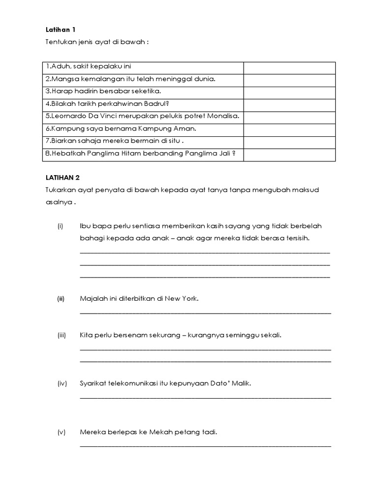 Latihan ayat tunggal dan ayat majmuk tahun 3full description. A) ayat aktif b) ayat pasif 2) pokok ubi itu dijaga oleh beliau dengan baiknya. Ragam ayat terdiri daripada ayat penyata, ayat tanya, ayat perintah, dan ayat seruan. Ragam bahasa menurut topik pembicaraan mengacu pada pemakaian bahasa dalam bidang tertentu, seperti bidang jurnalistik (persuratkabaran), kesusastraan, dan pemerintahan. Ayat penyata dikenali juga sebagai ayat berita atau ayat keterangan.